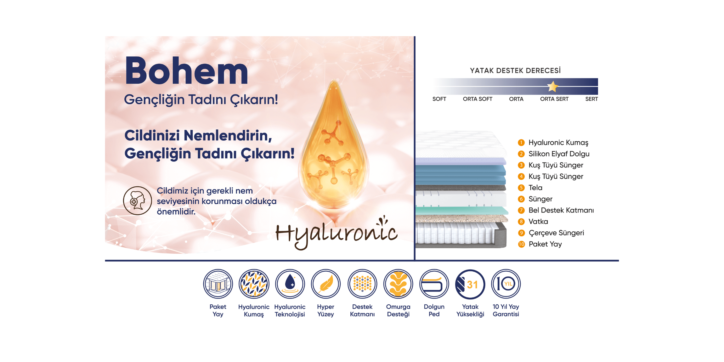 Bohem Yatak, hyaluronic kumaşı sayesinde cildinizi uyku boyunca nemlendirir ve esnekliğini artırır.