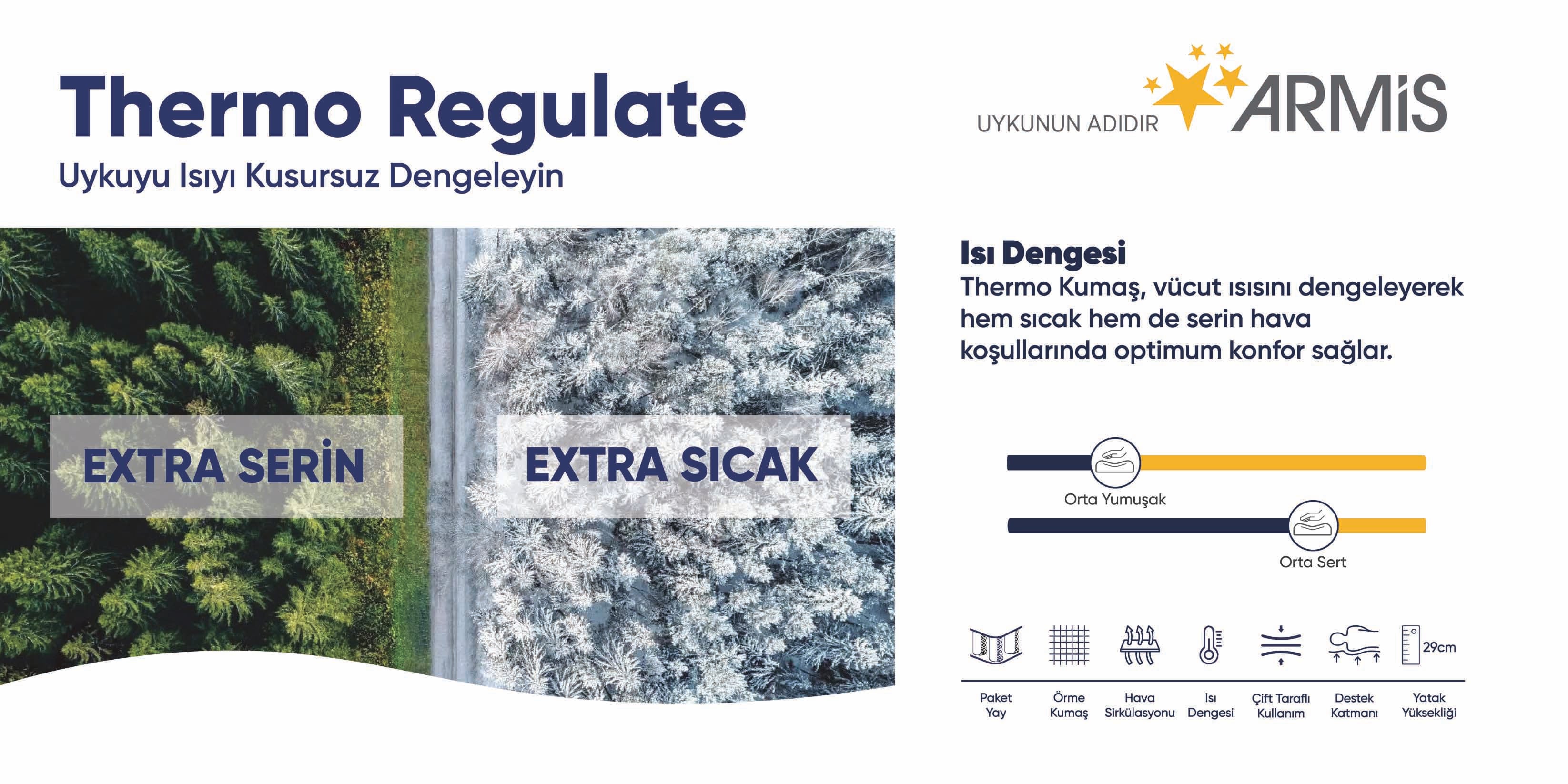 Thermo Regulate, spor ve doğadan ilham alan, üst kaliteli markaların özel kumaşları ve iplikleriyle tasarlanmıştır. Özel termal teknoloji sayesinde kışın sıcak, yazın serin tutarak klima etkisi yaratır. Vücudunuzun ısısına göre renk değiştiren özel iplikleri sayesinde uyku sırasında optimal rahatlık sağlar.